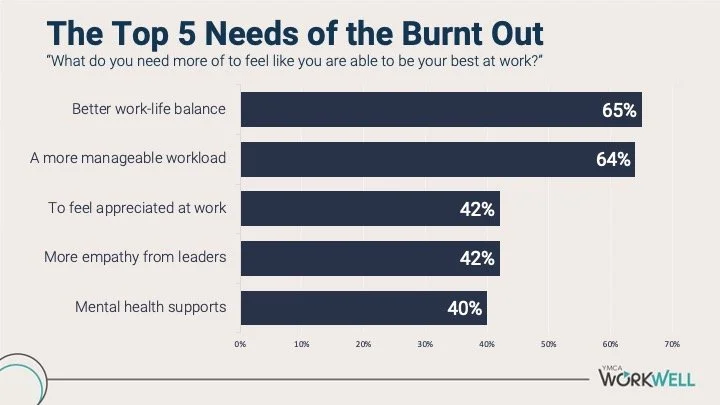 Our own research at YMCA WorkWell finds that when people are experiencing burnout, a need for more empathy from leaders is tied for third place, along with a need to feel more appreciated personally, and just behind better work/life balance and a more manageable workload (see Figure 1).