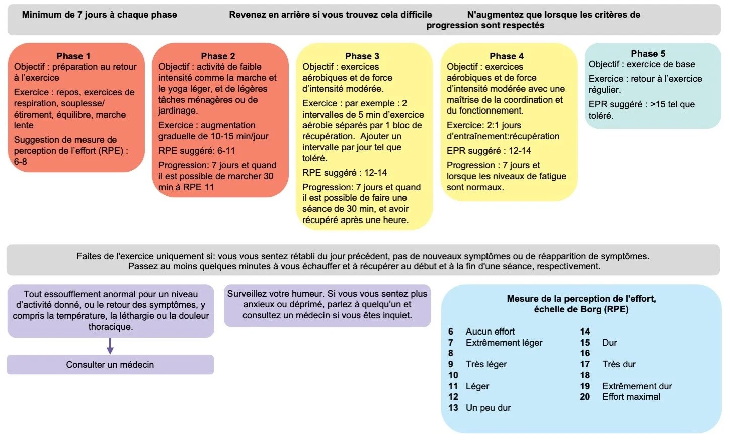 It is proposed to devote a minimum of 7 days to each phase to avoid sudden increases in training load. However, people should stay at the stage they feel comfortable with for as long as necessary. Watch for any inability to recover 1 hour after exercise and the next day, for abnormal shortness of breath, abnormal heart rate, excessive fatigue or lethargy, and markers of poor mental health. If this happens or if you are not progressing as planned, you should return to a previous phase and seek medical attention if in doubt. Keeping a journal of exercise progress, as well as the intensity of exertion, any changes in mood and, for those who are used to measuring it, objective fitness data such as heart rate, can be useful in tracking progress.